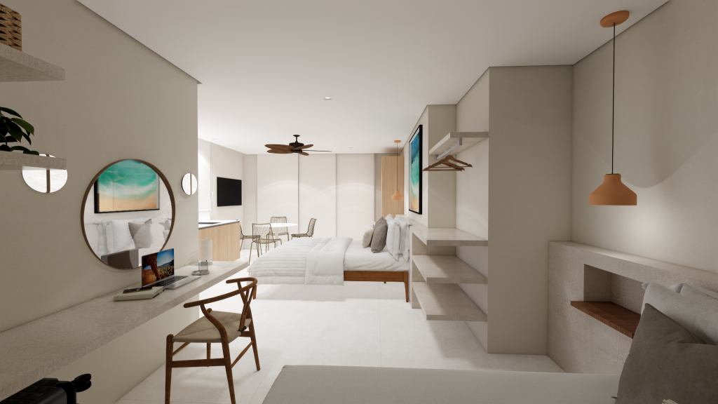 Designed with comfort and elegance in mind, this beautifully finished open-plan studio features two plush queen-size beds and refined, high-end details throughout. Abundant natural light enhances the airy layout, creating a warm and welcoming atmosphere.